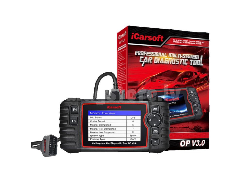 iCarsoft OP V3.0 ir diagnostikas rīks, kas ļauj pieslēgties visām Opel auto vadības ierīcēm. Ierīce ir aprīkota ar 4" krāsu ekrānu un ir gatava lietošanai. Ir ierīces programmatūras atjauninājumi ir pilnīgi bezmaksas un tiek veikti, izmantojot datoru (USB kabelis iekļauts komplektā). Ierīcei ir plašs atbalstīto valodu klāsts. Izstrādājumā tiek atbalstīti automobiļi no 1996. līdz 2020. gadam. Ierīce ļauj detalizēti diagnosticēt visus agregātus, kā arī piedāvā daudz servisa funkciju, piemēram, servisa intervālu atjaunošanu, DPF reģenerāciju, elektrisko stāvbremžu diagnostiku un atbrīvošanu, inžektoru kodēšanu, akumulatora reģistrāciju un daudz ko citu. Ir ierīci savieno ar automašīnu, izmantojot OBD-II kabeli.