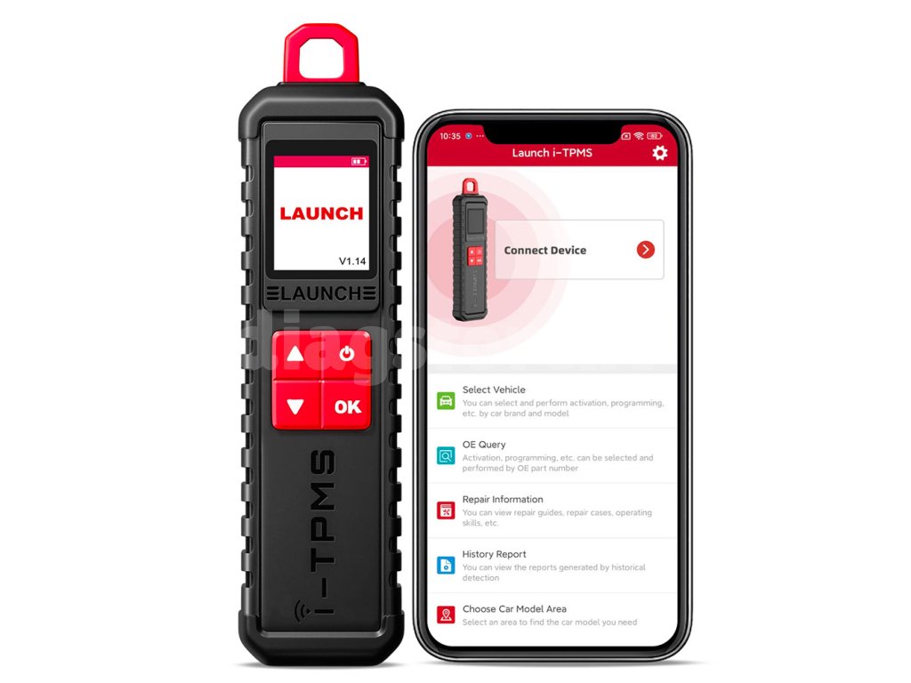 Launch i-TPMS ir ierīce TPMS vārstu kodēšanai, klonēšanai un jaunu TPMS vārstu izveidei. Urādi var izmantot kopā ar atbalstīto Launch diagnostiku vai arī to var kontrolēt, izmantojot īpašu Android lietotni. Varat kodēt vārstus, piemēram, no viedtālruņa.
